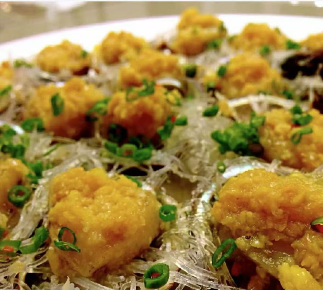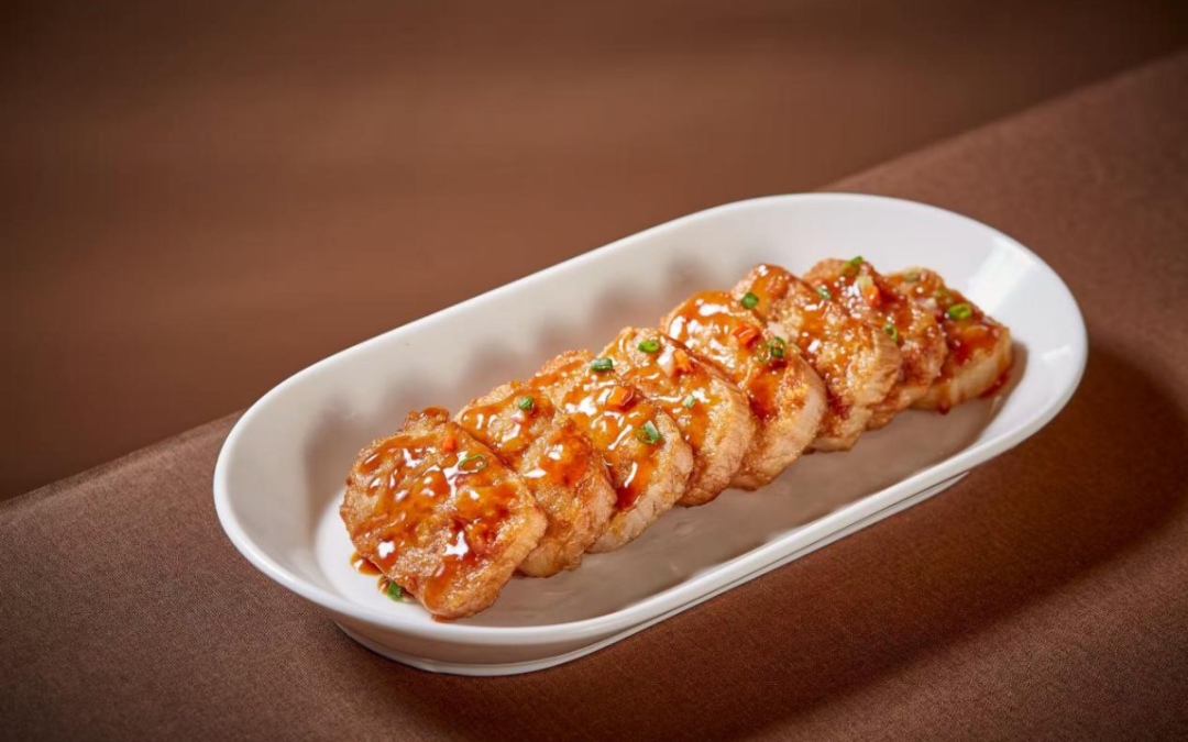 選用頂角糕蟹斬件平鋪于肉餅上,猛火蒸制,肉餅完全吸收糕蟹鮮味,鮮香肉滑。