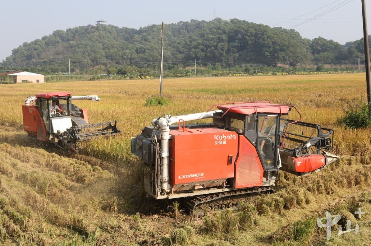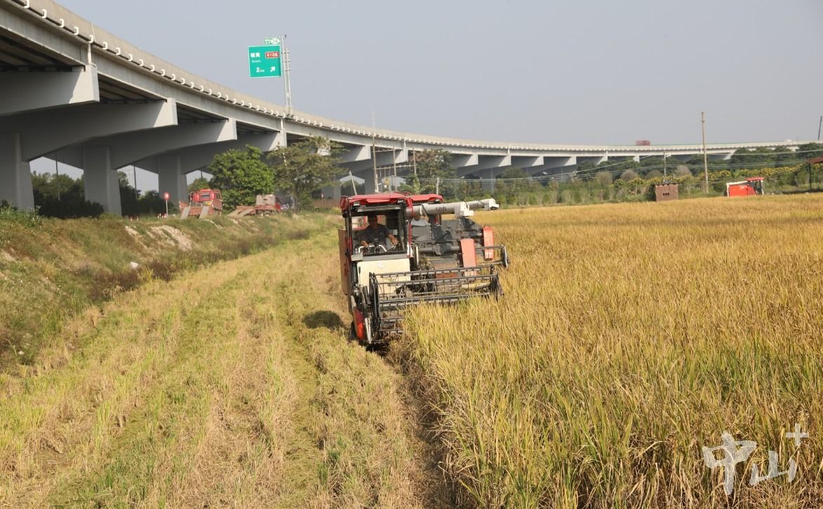 12月9日上午,陽光灑在板芙鎮(zhèn)里溪村的田野上,200多畝金黃稻田里傳來陣陣機械轟鳴,3臺收割機穿梭其間,將飽滿的稻穗卷入機身,這是該村在昔日花木場復(fù)耕復(fù)種后,迎來的首次水稻收割。